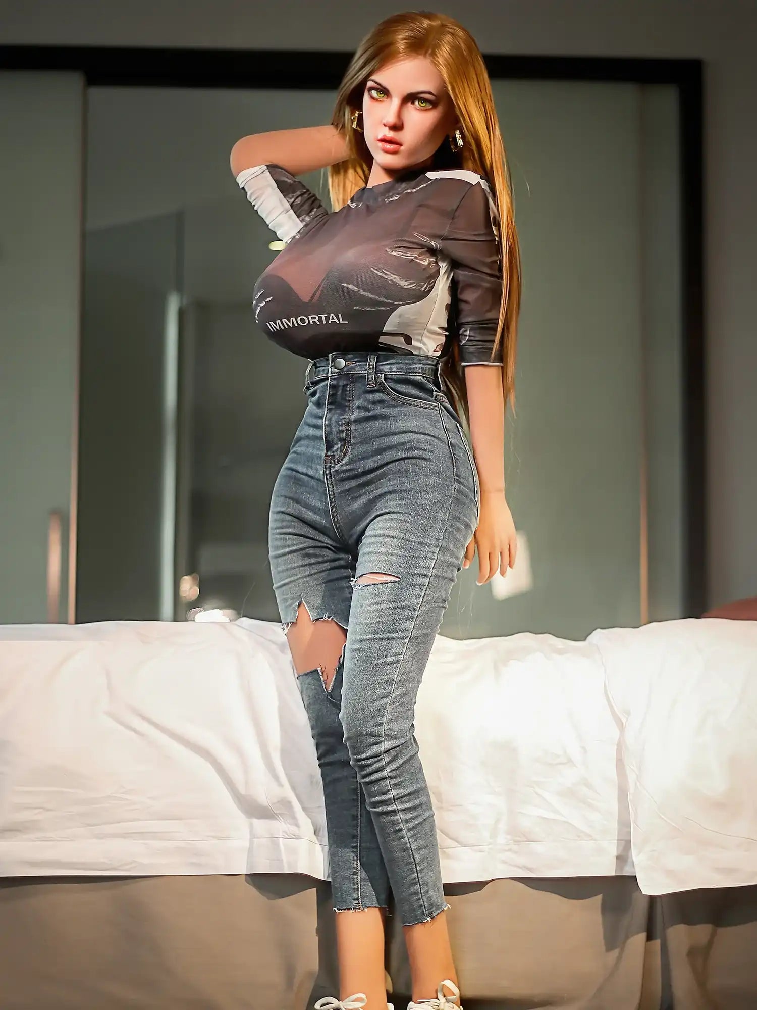 This blonde BBW Sex Doll. with a shocking 87 cm super bust. is paired with a sexy tight top and charming eyes. which is soul-stirring. The soft TPE material restores the real touch. and every grasp makes people’s heart beat faster. and they can’t extricate themselves from it.