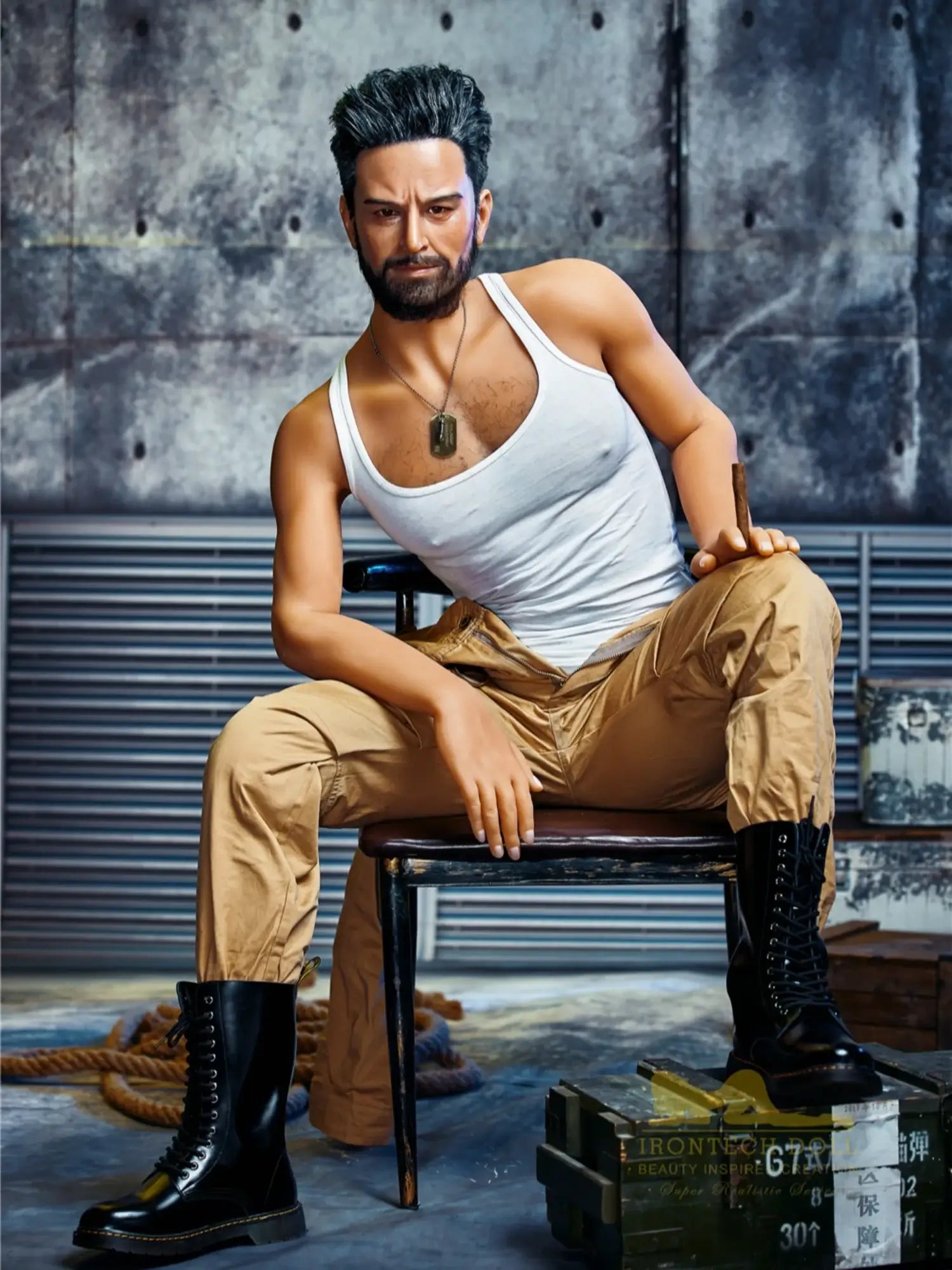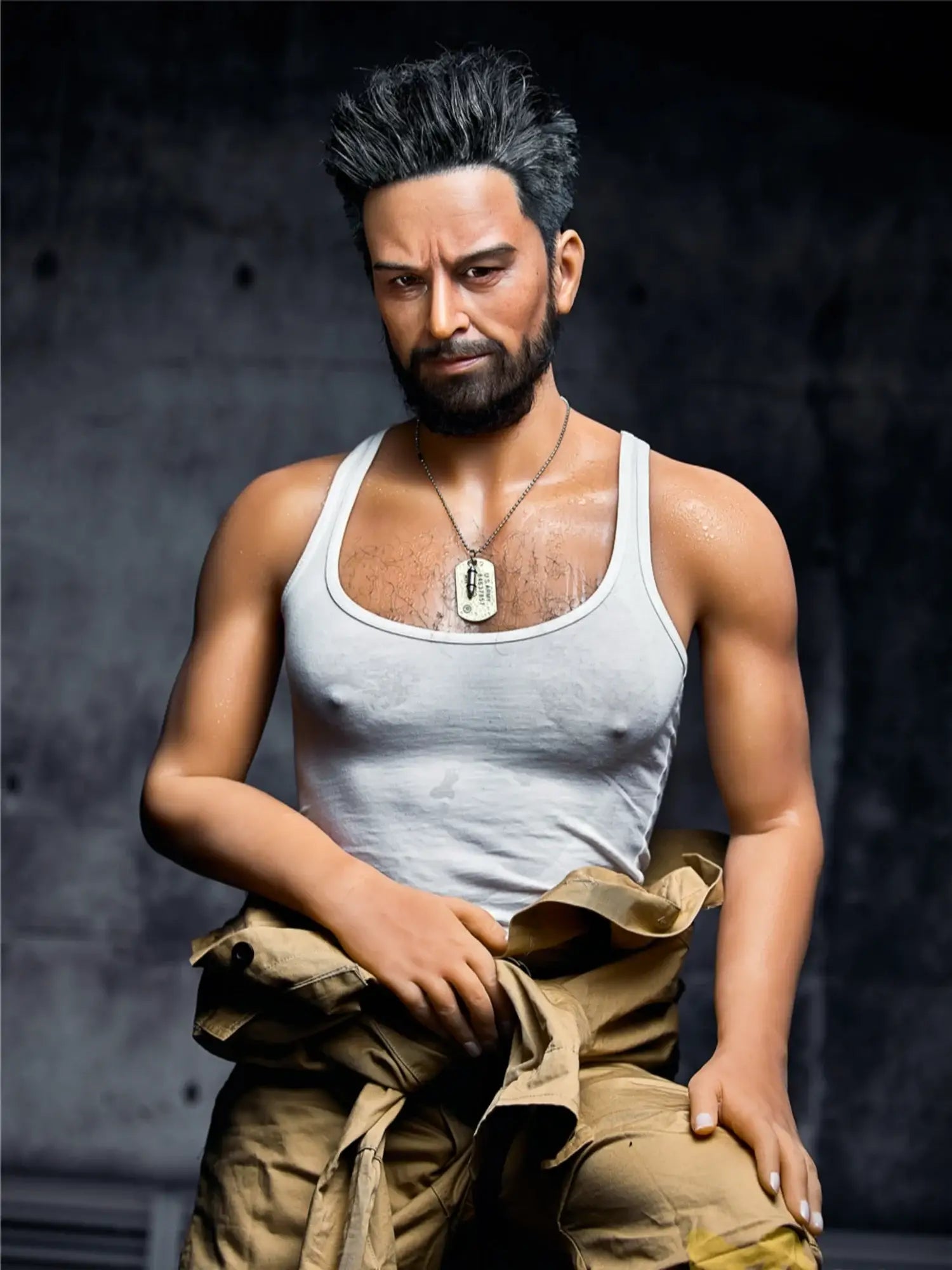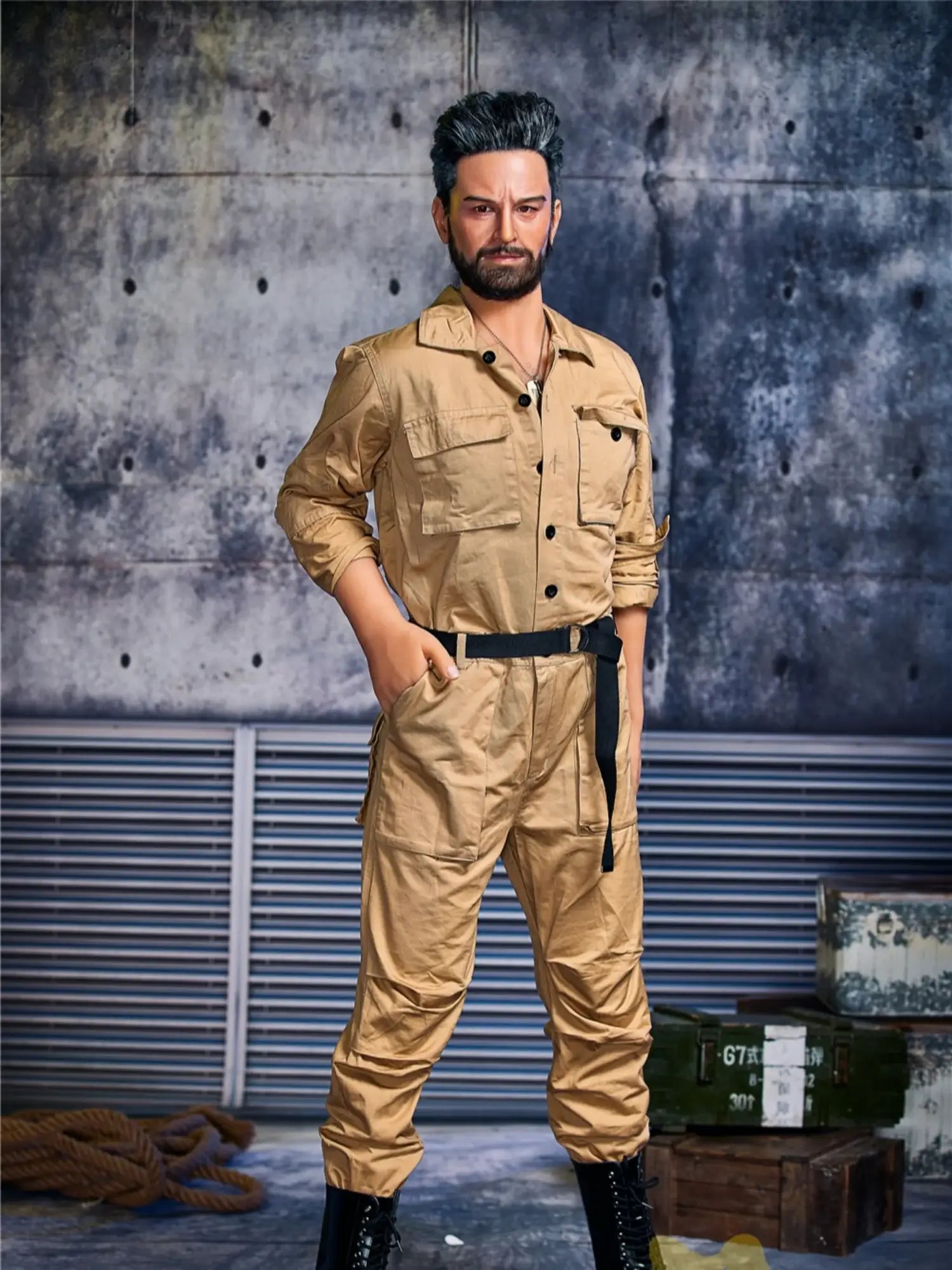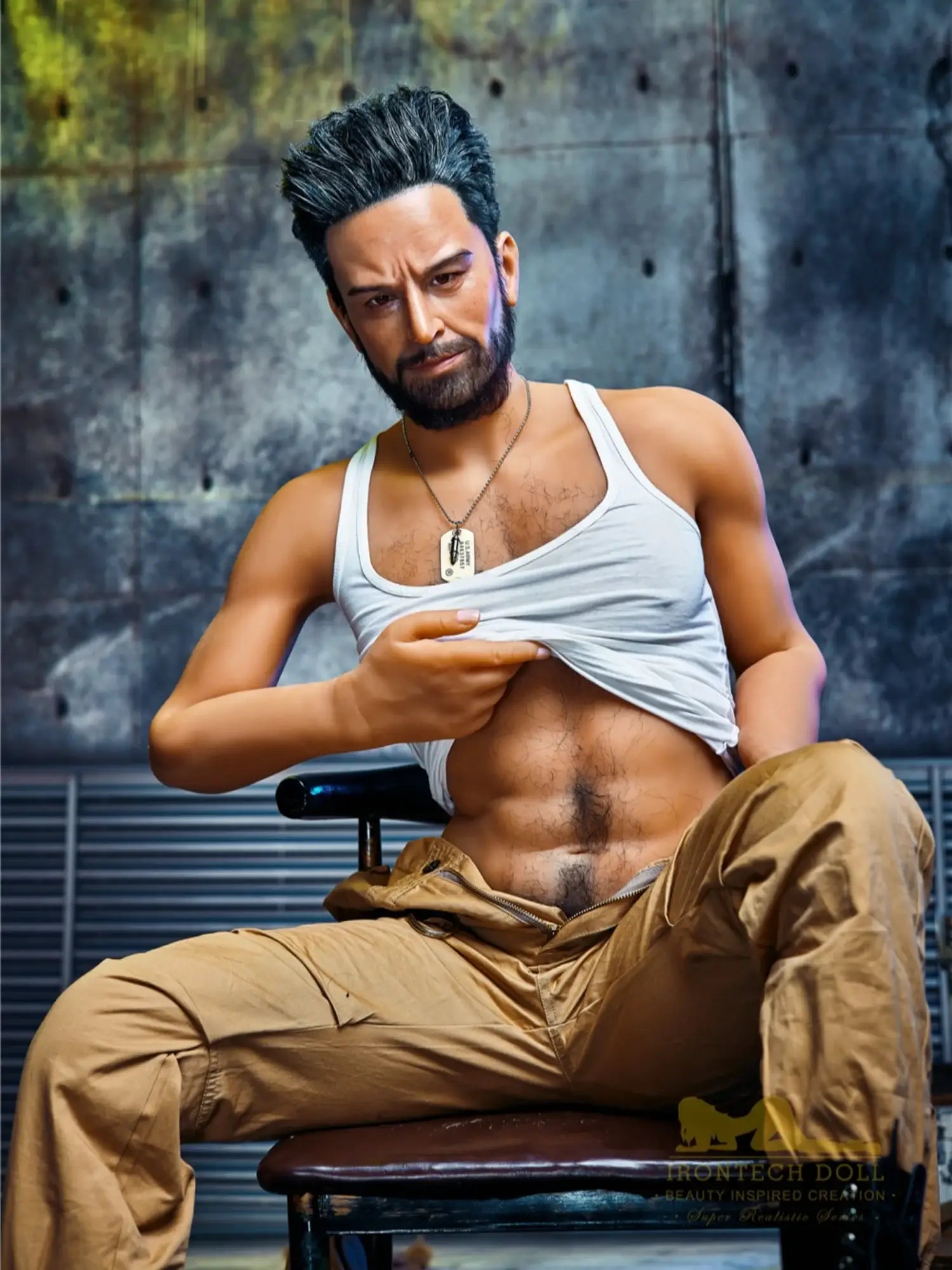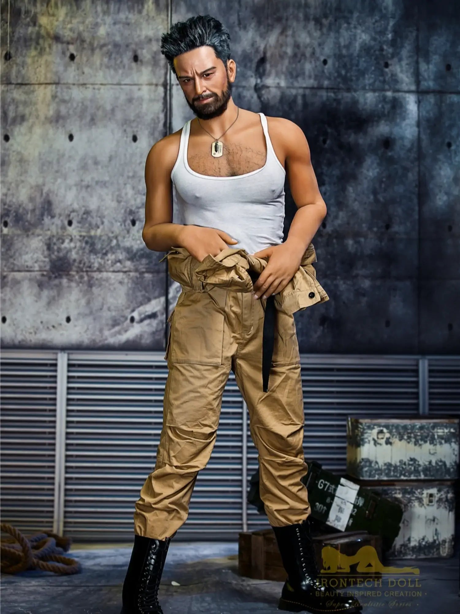 His body is tall and straight. 175cm height with 90cm firm chest. showing a kind of mature male charm. He is wearing a work uniform. the tight fabric fits his muscular body perfectly. and the vaguely visible muscle lines under his undershirt make people’s heart beat faster. With a shoulder width of 47cm. his entire upper body is full of power. and his beard adds a bit of wildness and toughness. This Male Sex Doll makes you feel irresistibly oppressive with its authentic sculpted feel and mature masculinity.