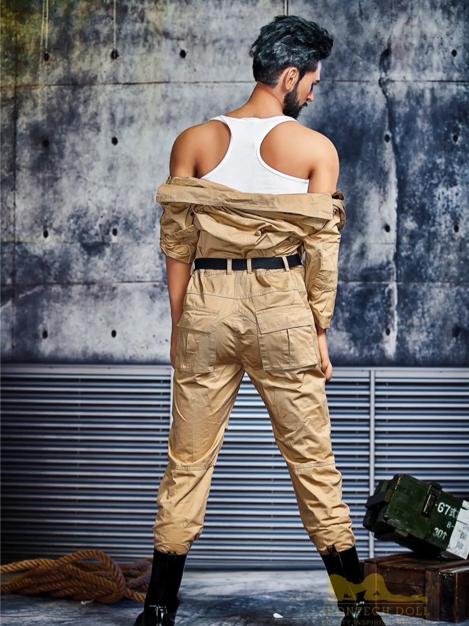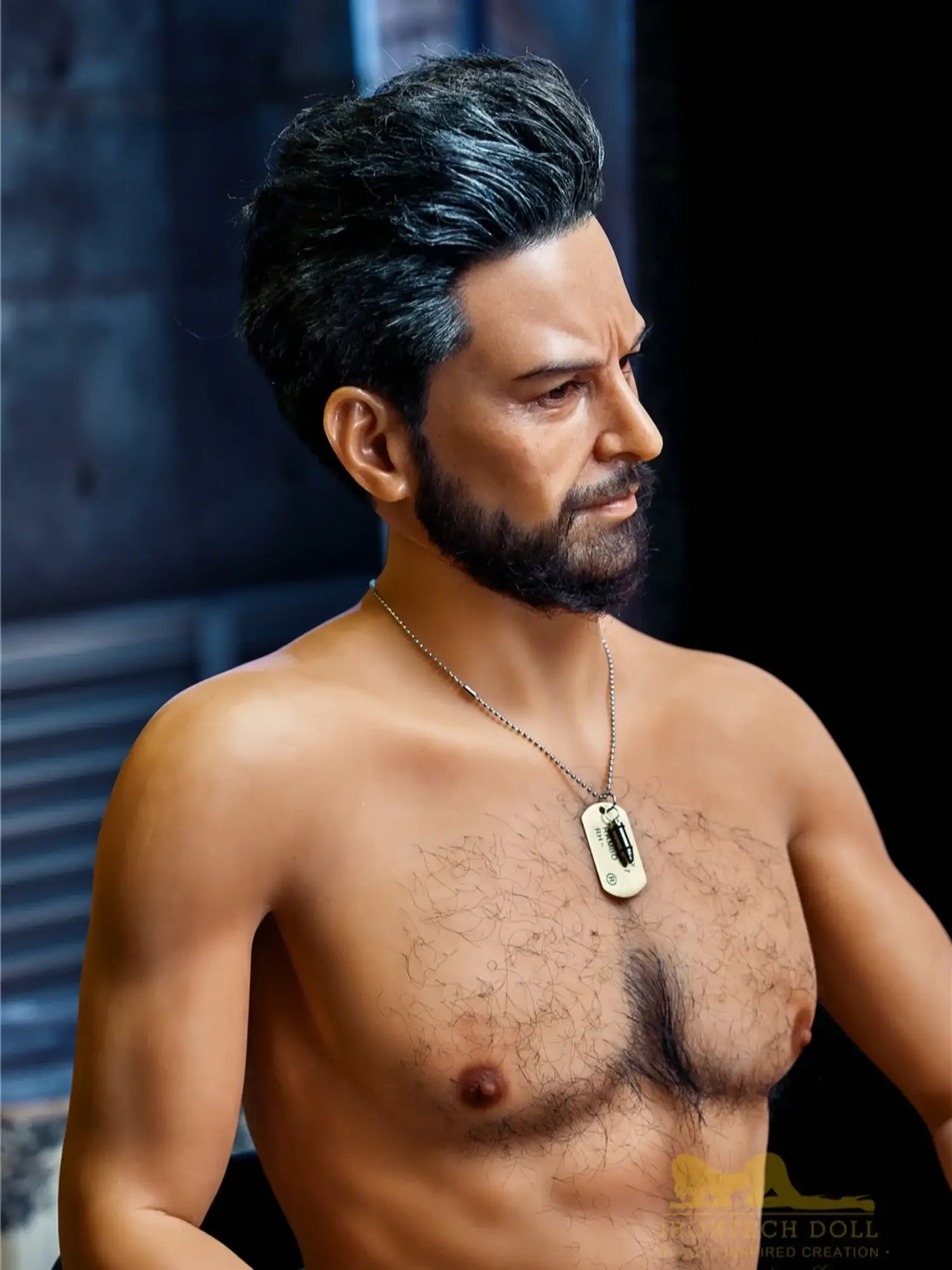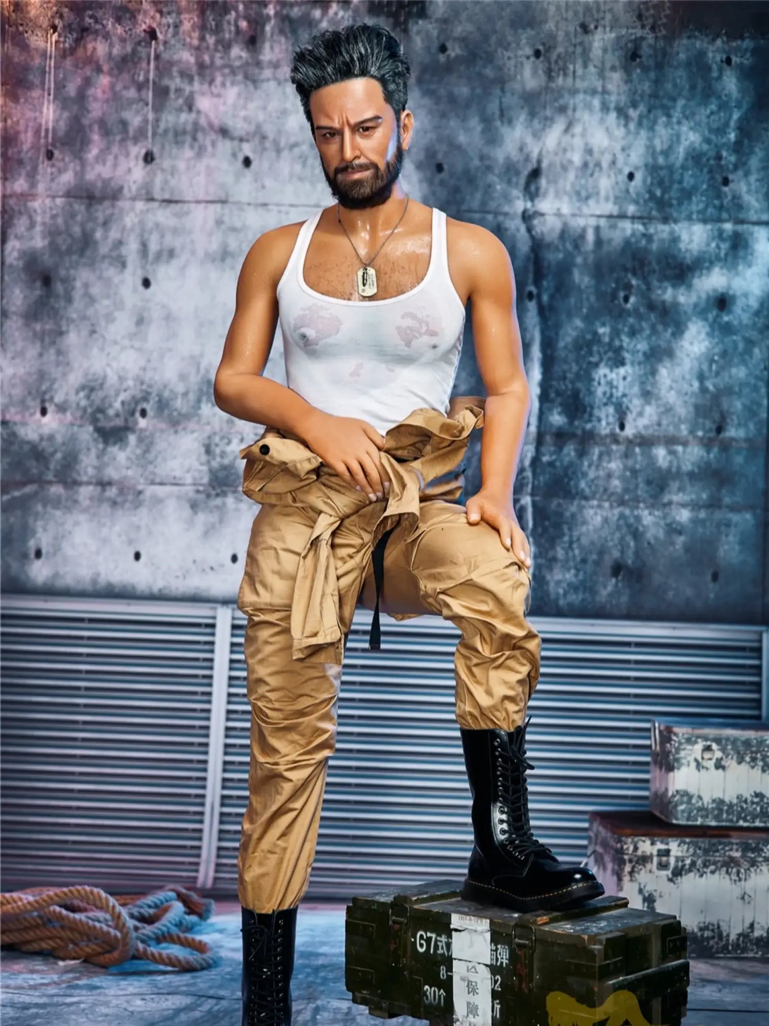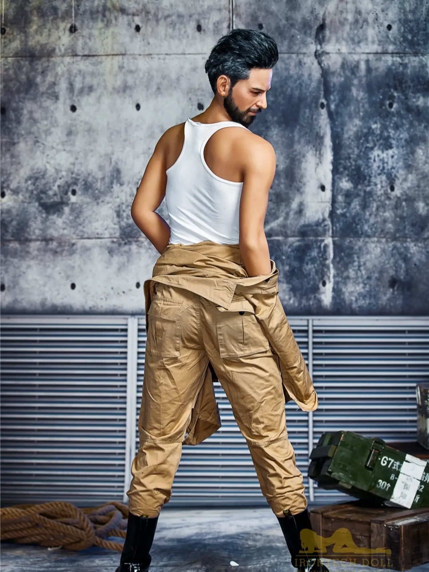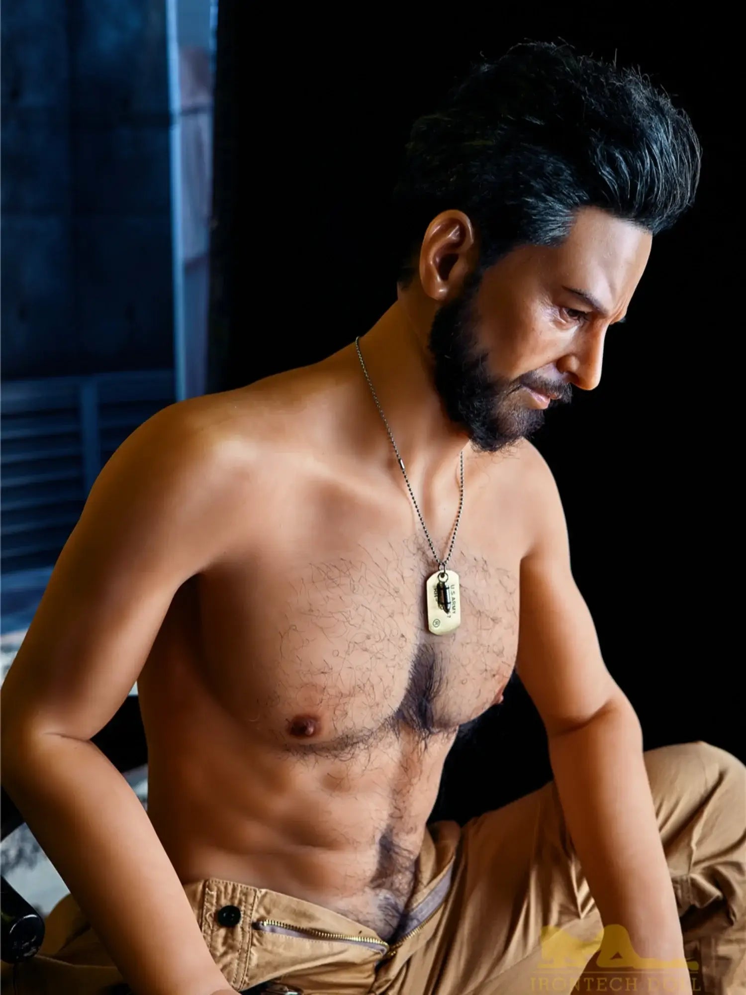 His body is tall and straight. 175cm height with 90cm firm chest. showing a kind of mature male charm. He is wearing a work uniform. the tight fabric fits his muscular body perfectly. and the vaguely visible muscle lines under his undershirt make people’s heart beat faster. With a shoulder width of 47cm. his entire upper body is full of power. and his beard adds a bit of wildness and toughness. This Male Sex Doll makes you feel irresistibly oppressive with its authentic sculpted feel and mature masculinity.