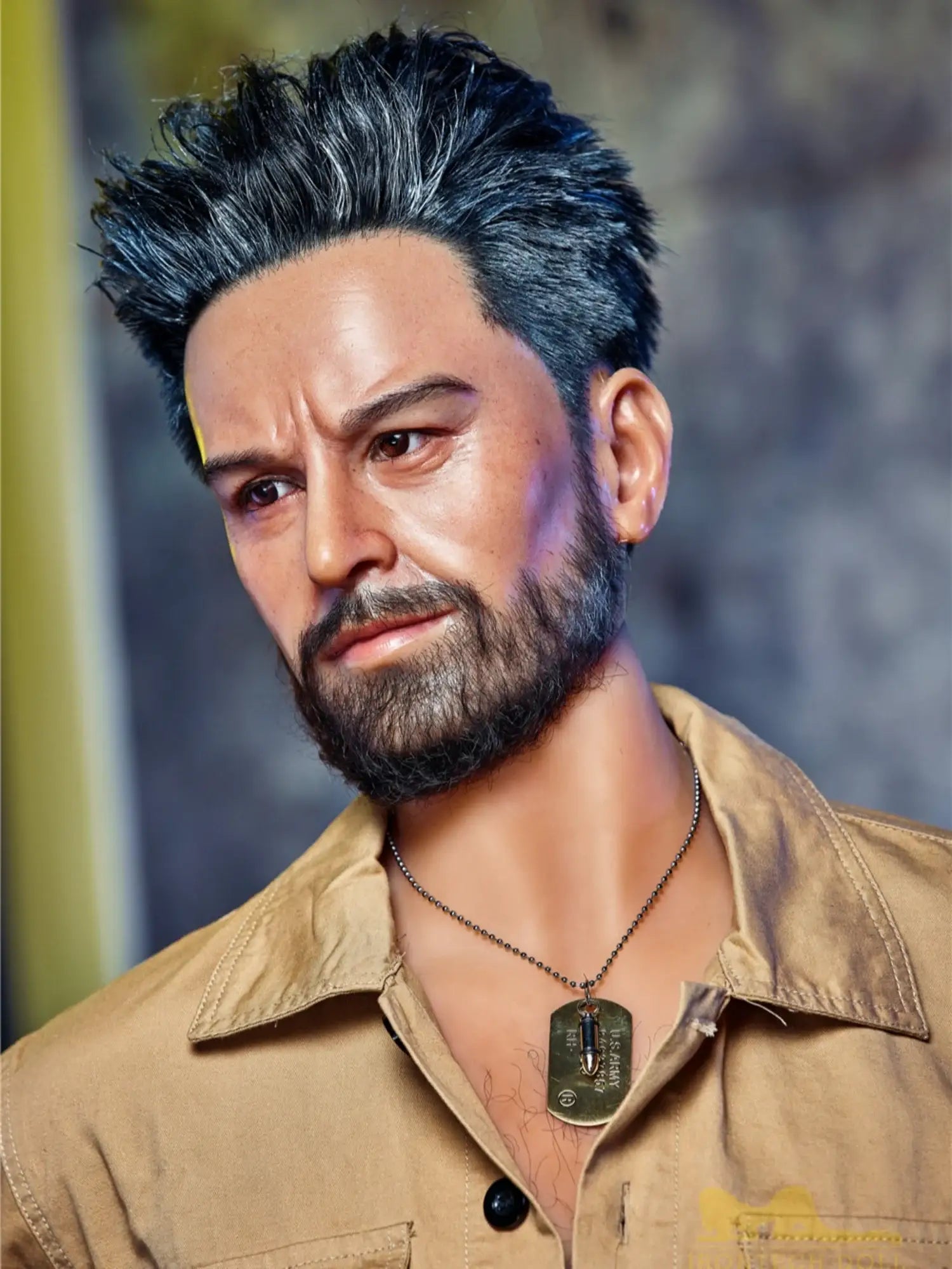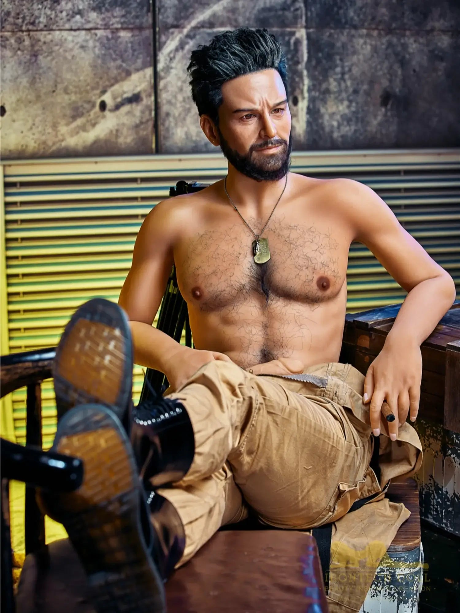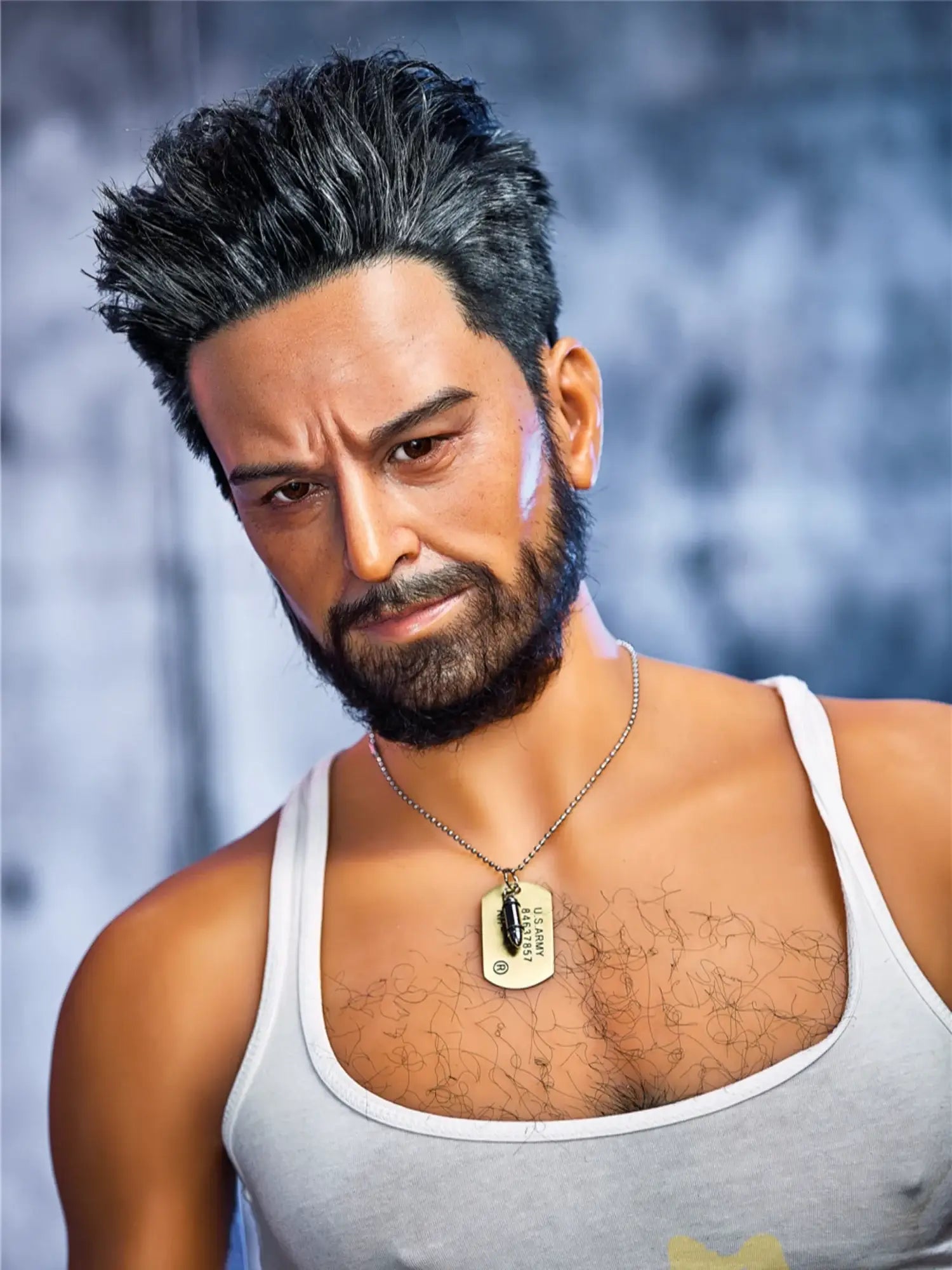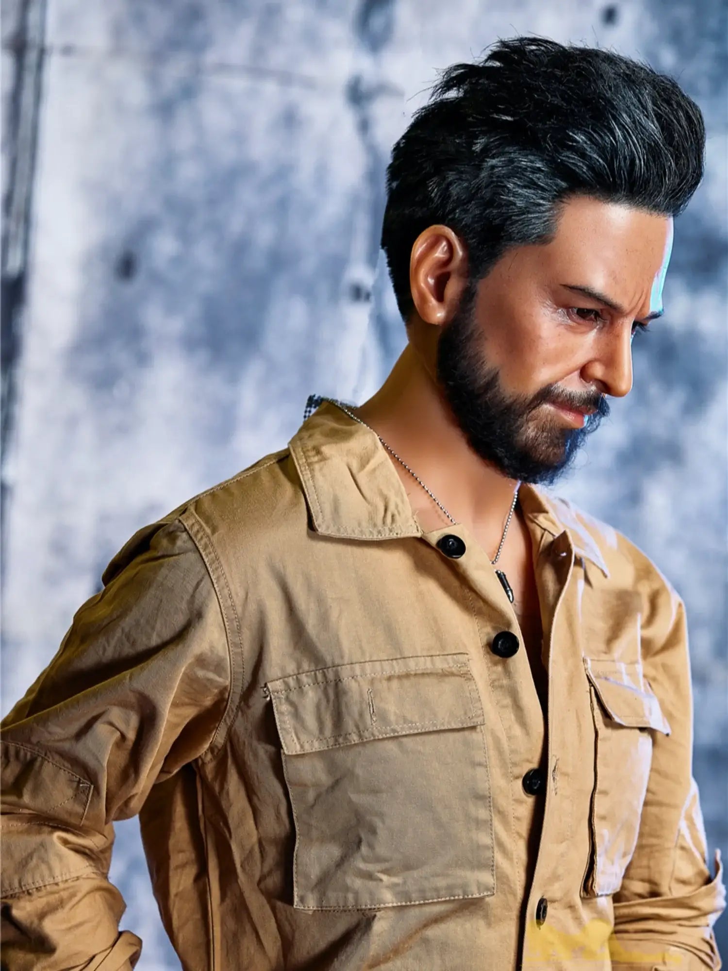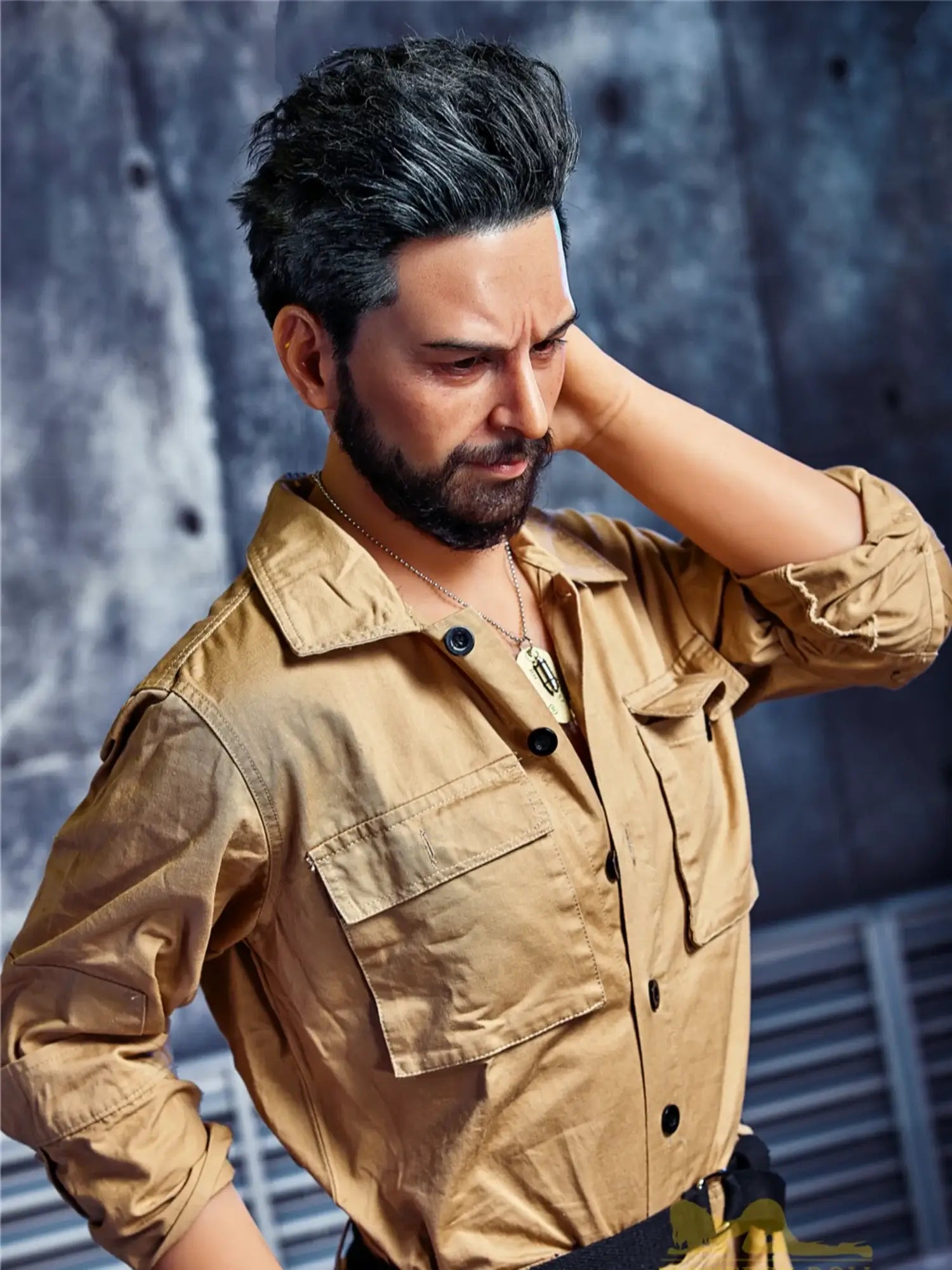 His body is tall and straight. 175cm height with 90cm firm chest. showing a kind of mature male charm. He is wearing a work uniform. the tight fabric fits his muscular body perfectly. and the vaguely visible muscle lines under his undershirt make people’s heart beat faster. With a shoulder width of 47cm. his entire upper body is full of power. and his beard adds a bit of wildness and toughness. This Male Sex Doll makes you feel irresistibly oppressive with its authentic sculpted feel and mature masculinity.