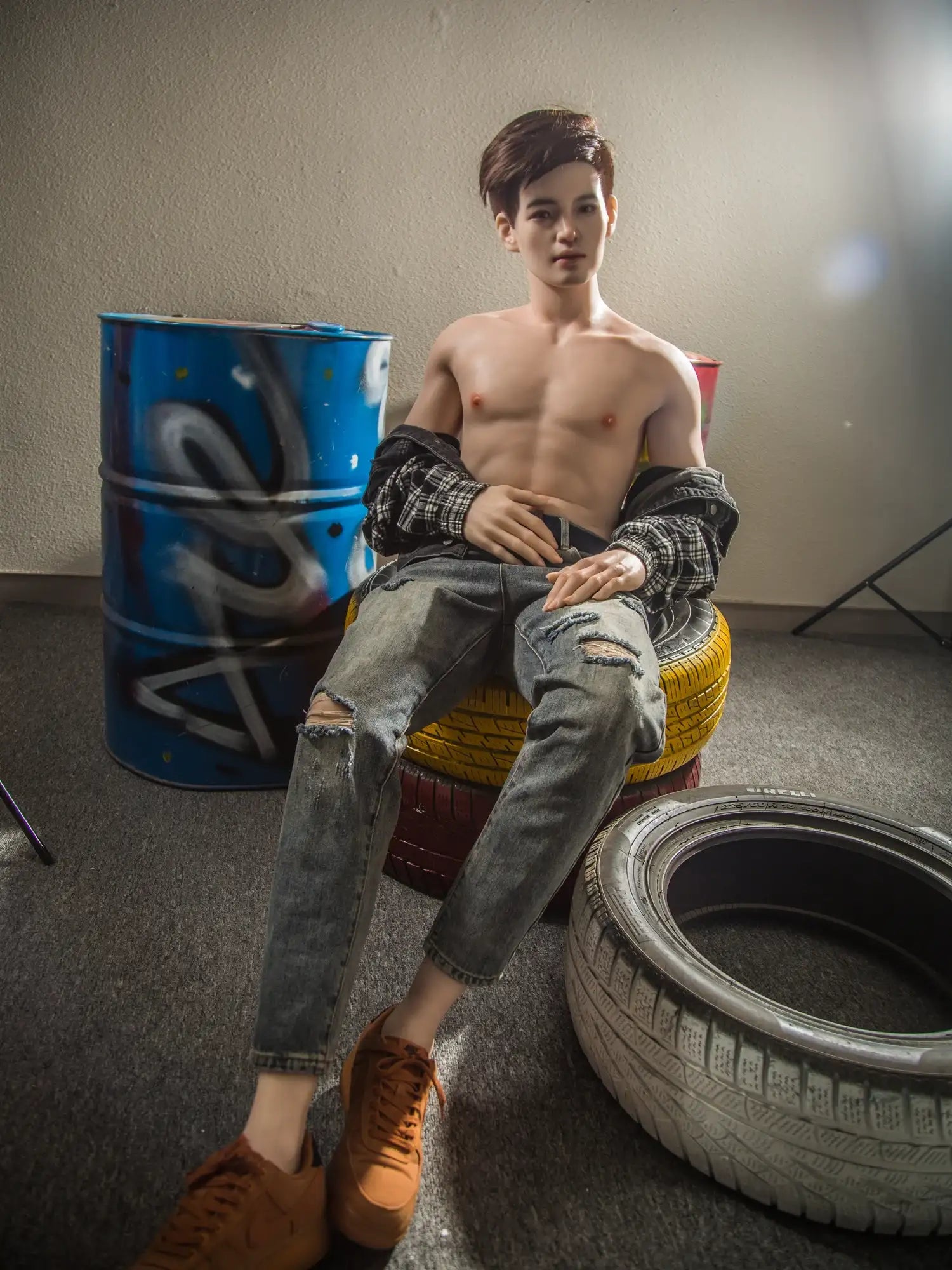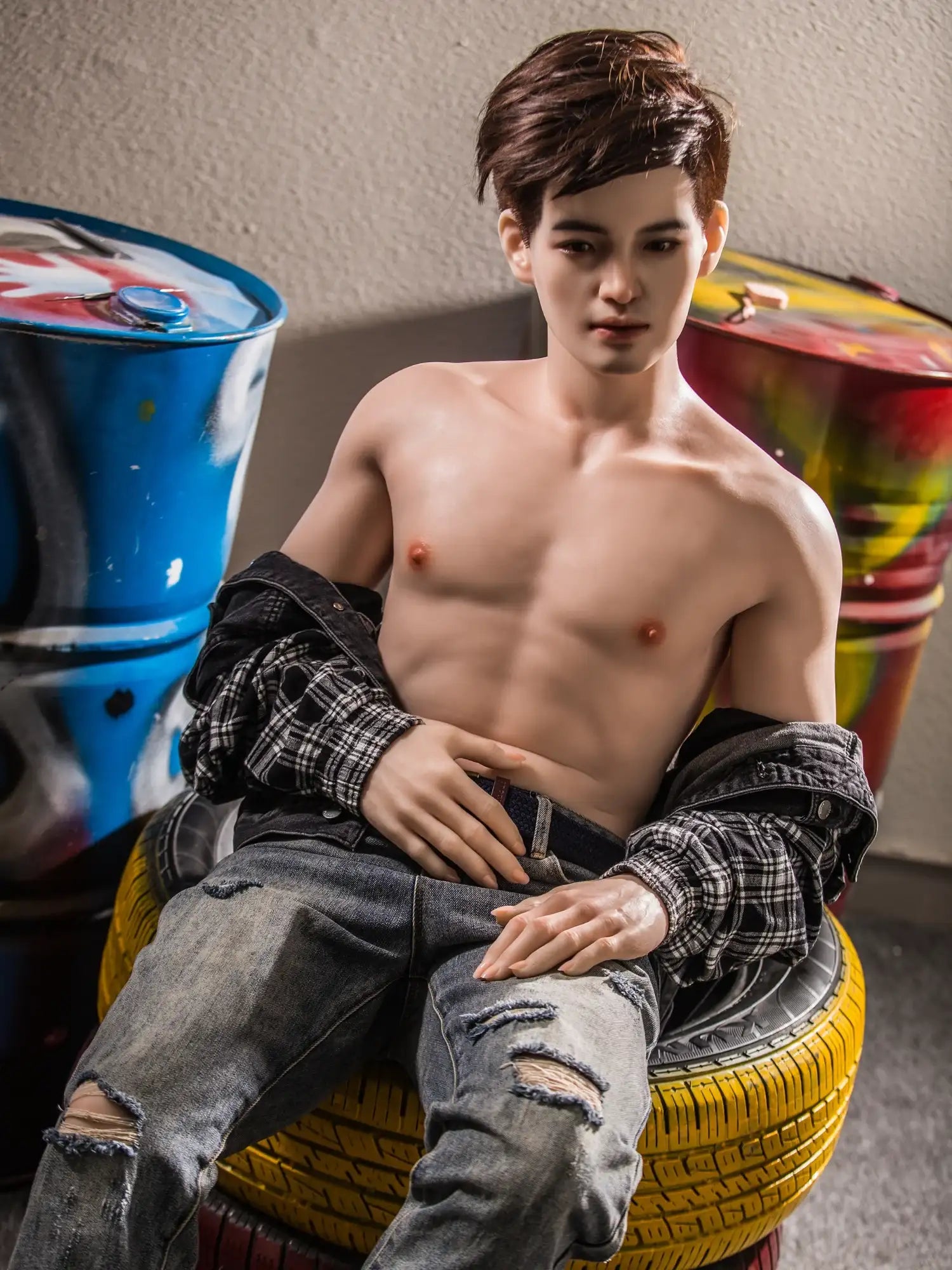 Sitting back with a cocky gaze and streetwear flair. this femboys sex doll channels major runway rebel energy. At 177cm tall and 55kg. his sculpted abs. broad shoulders. and subtle muscle lines strike the perfect balance between masculine edge and femboy charm. Made from full-body platinum silicone. his skin feels astonishingly lifelike — warm. soft. and addictively touchable.
